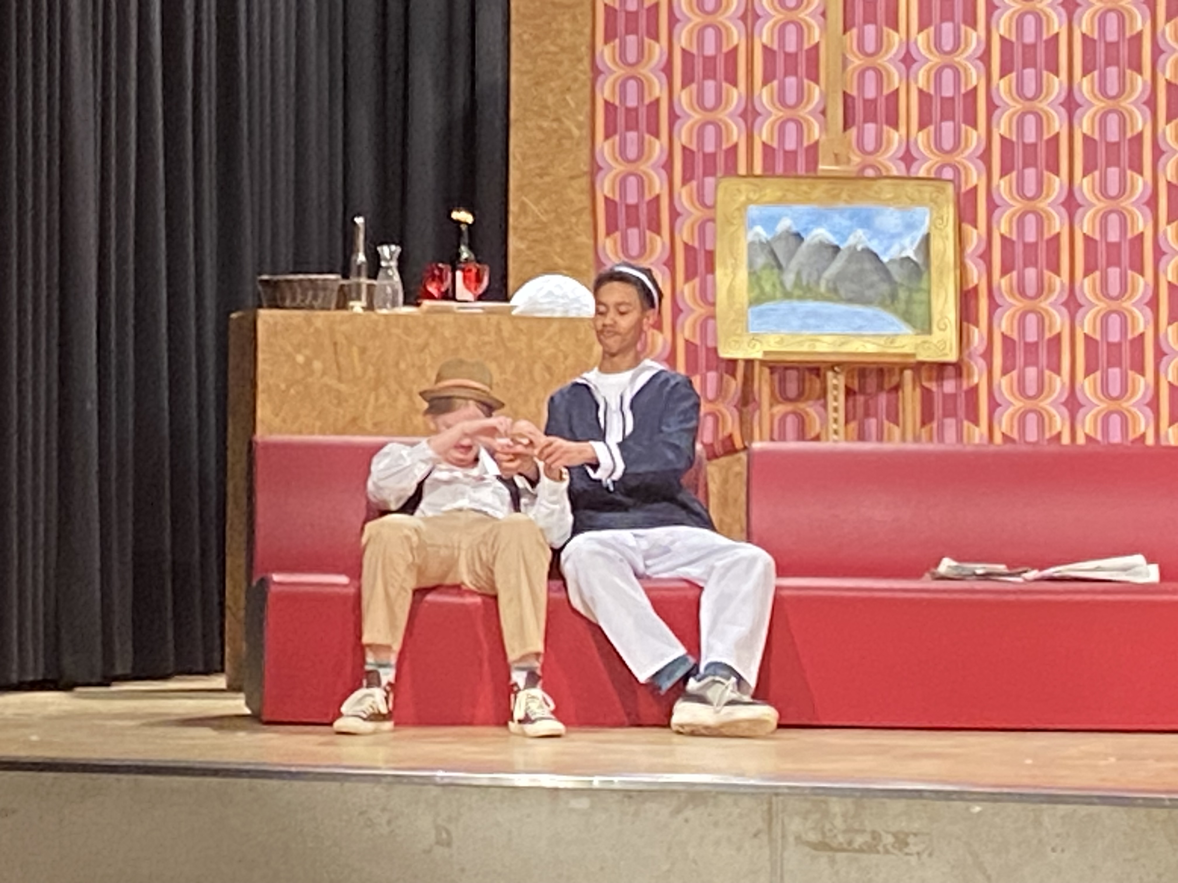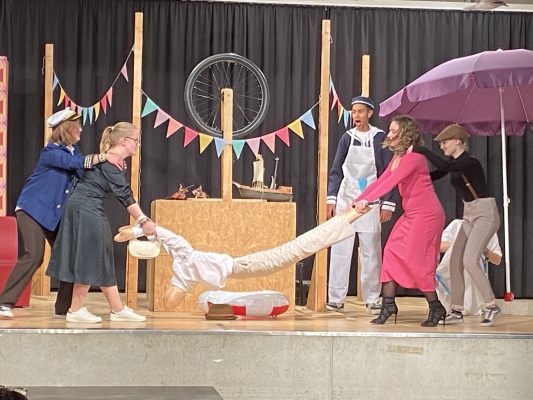 Mit viel Komik gespickt wurde das Stück „Mord auf hoher See – wer tötete Monsieur Duprais?“ von den jungen Schauspielerinnen und Schauspielern auf die Bühne gebracht. So klebte sich beispielsweise der Ermordete Monsieur Duprais, gespielt von Klara Plaßmann, die drei tödlichen Einschusslöcher selbst auf sein Hemd – begleitet von herzhaftem Lachen des Publikums. Zwischenzeitlich wurde der Leichnam durch eine Puppe ersetzt, an der gezogen und gezerrt wurde. Als dann Plaßmann wieder in die Rolle des Toten schlüpfte, übernahm prompt der Schiffsjunge Freddie, brilliant gespielt von Jeremy Oechsle, naiv fasziniert die Gestik: Wie cool grüßt eine Leiche?